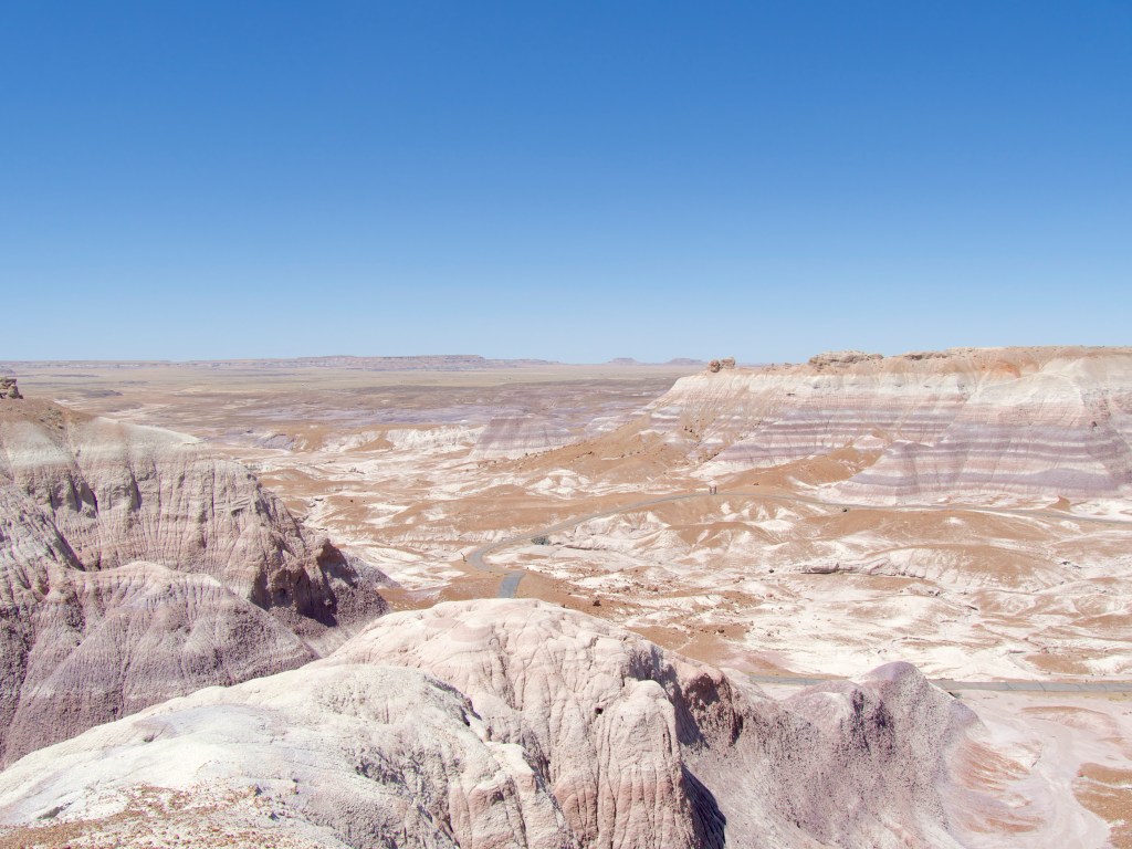 This is the Blue Mesa Trail in the Petrified Forest National Park, which is located in eastern Arizona. Blaze and I enjoyed taking in our surroundings as we traversed the 1-mile trail. The colorful landscape reminded me somewhat of the Badlands NP in South Dakota, but with different colors — less of the yellows, oranges, and greens that you find in Badlands. Here, you see more of the reds, blues, and purples. The petrified trees glisten in the bright sunlight like diamonds.